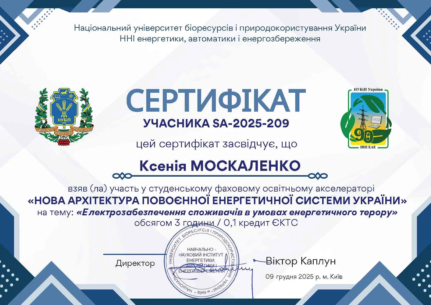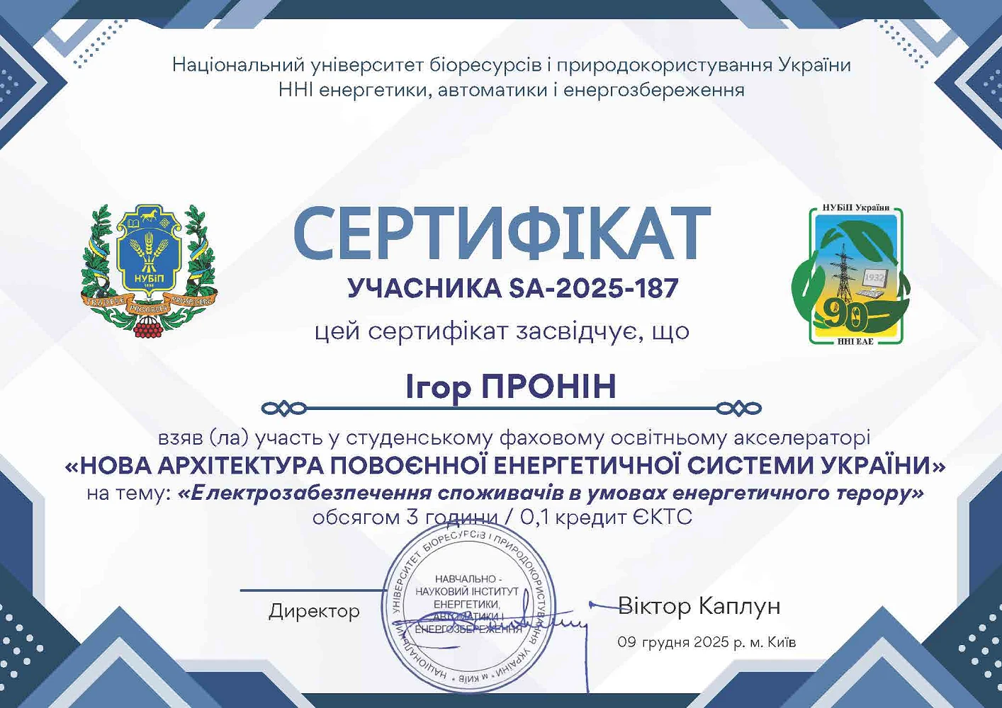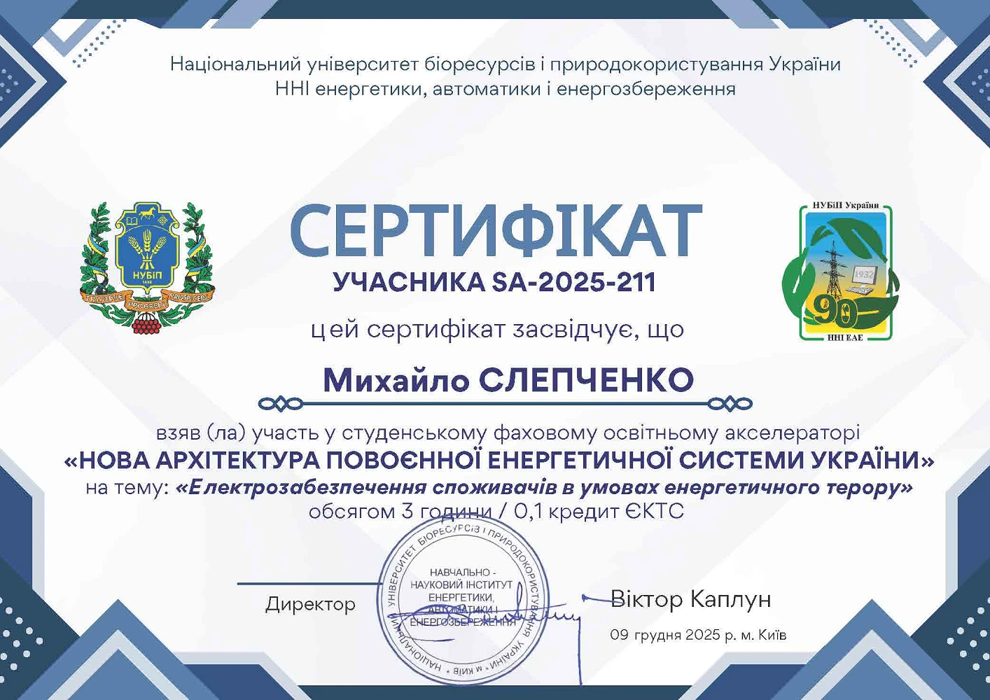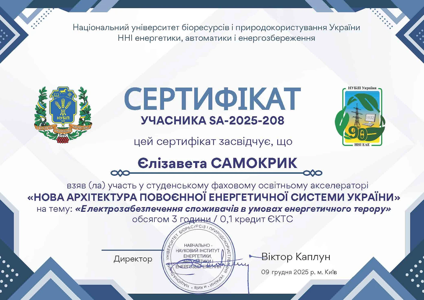 - Бакалаври (ОПП "Електроенергетика, електротехніка та електромеханіка"): Москаленко Ксенія (гр. ЕЕ-24), Самокрик Єлізавета (гр. ЕЕ-24), Михайло Слепченко (гр. ЕЕ-23мб).